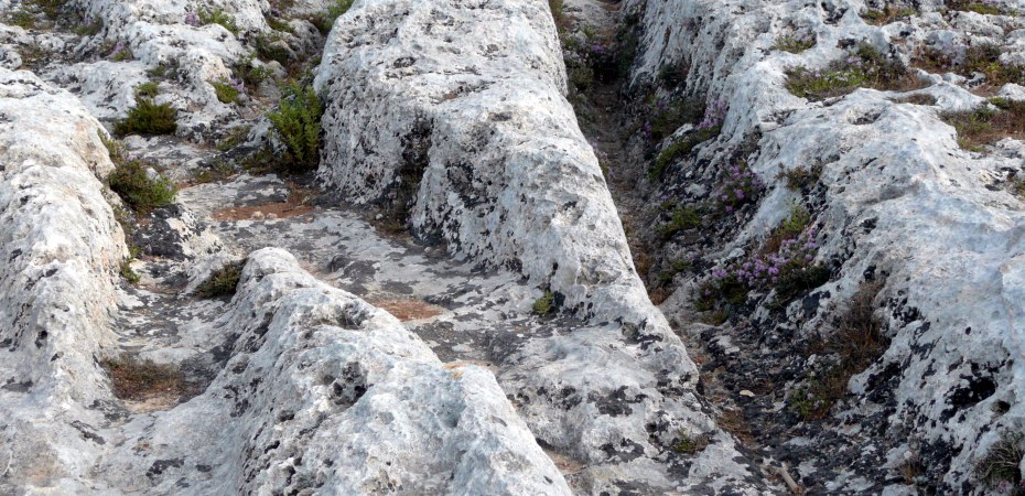 D’intrigantes ornières en forme de sillons ; des entailles dans la roche, que l’on retrouve en pleine campagne, tant sur Malte que sur Gozo.
