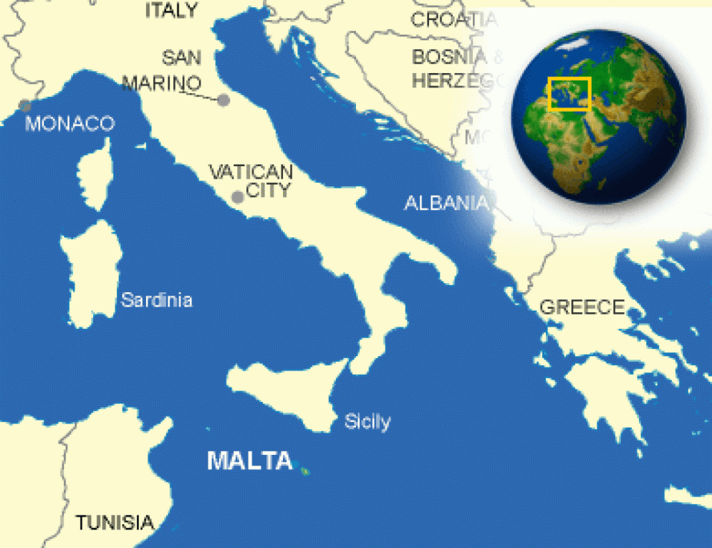 Ce petit archipel est situé au centre de la Méditerranée ; c’est le pays le plus au sud de tous les pays d’Europe. A mi-chemin entre Alexandrie et Gibraltar d’une part, et entre la Sicile et l’Afrique du Nord d’autre part. A environ 350 kms des côtes d’Afrique du Nord et à 100 kms de la Sicile.