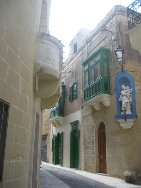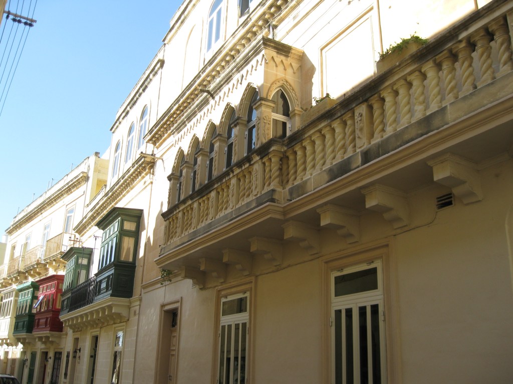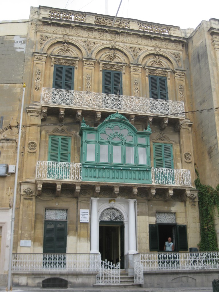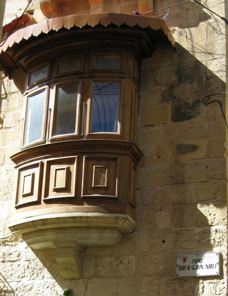 Cet élément de construction : la fenêtre à encorbellement (balcon en avant-corps) et formant loggia ou oriel, est omniprésent dans les rues des villes et des villages maltais ; vous en verrez de belles alignées dans les rues des villes.