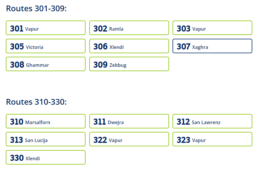 1 bus toutes les 30 minutes (ligne 301) entre Le terminal de ferry (Mgarr) et la gare routière de Victoria/Rabat.